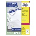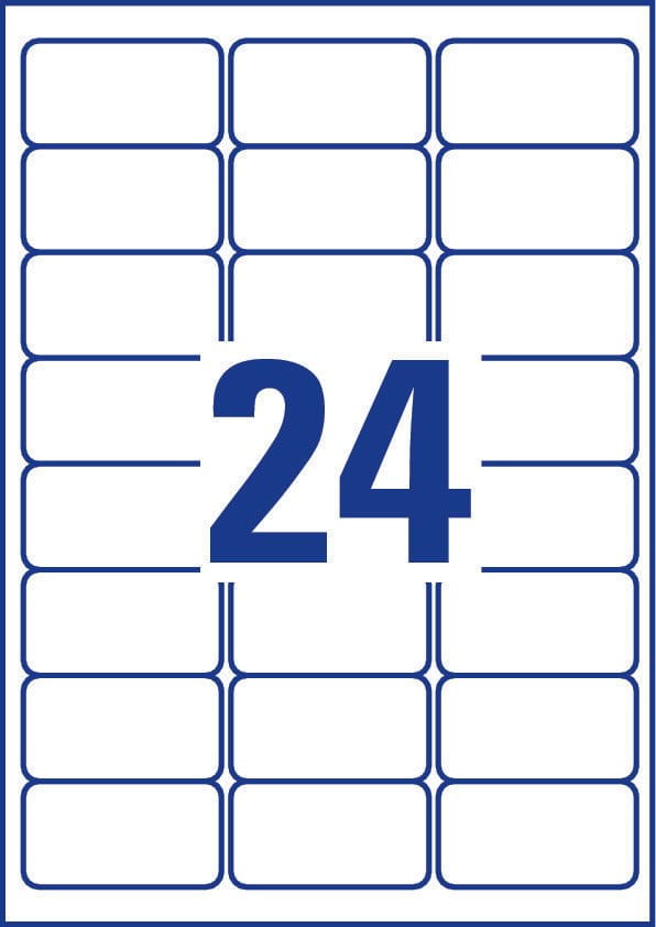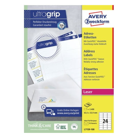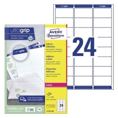 Etykiety adresowe Avery Zweckform L7159-100 o wymiarach 63,5 x 33,9 mm, przeznaczone do drukarek laserowych.Opakowanie zawiera 2400 etykiet na 100 arkuszach.