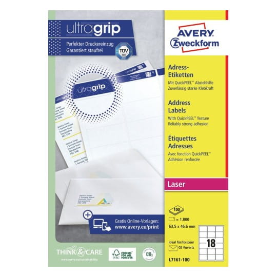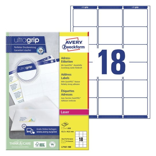 Etykiety adresowe Avery Zweckform L7161-100 o wymiarach 63,5 x 46,6 mm.Przeznaczone do drukarek laserowych, z technologią ultragrip zapewniającą precyzyjne prowadzenie