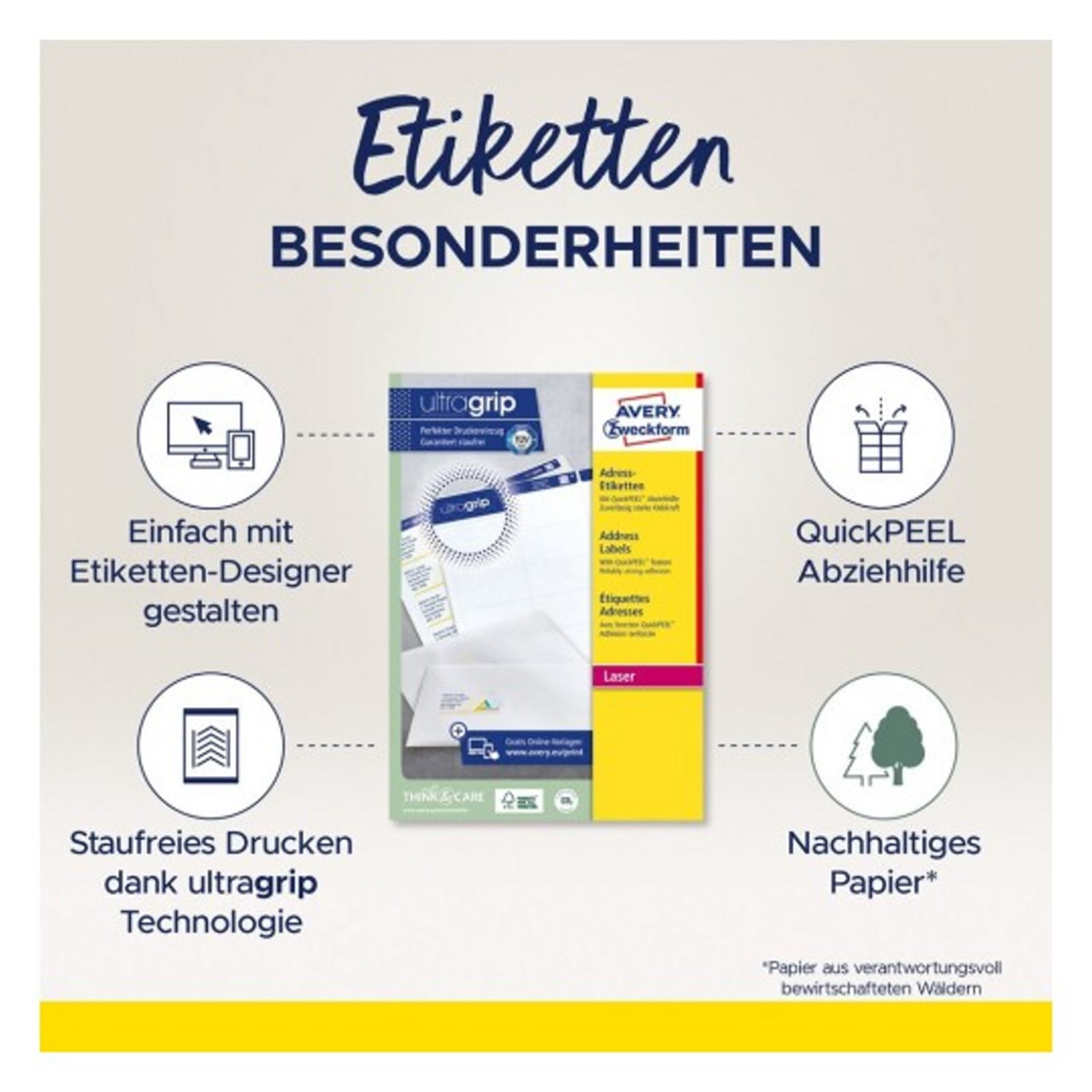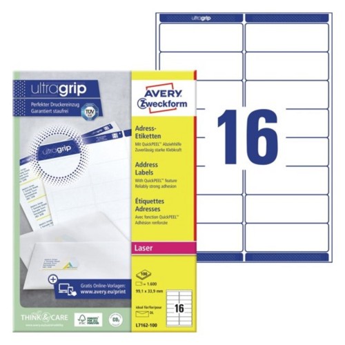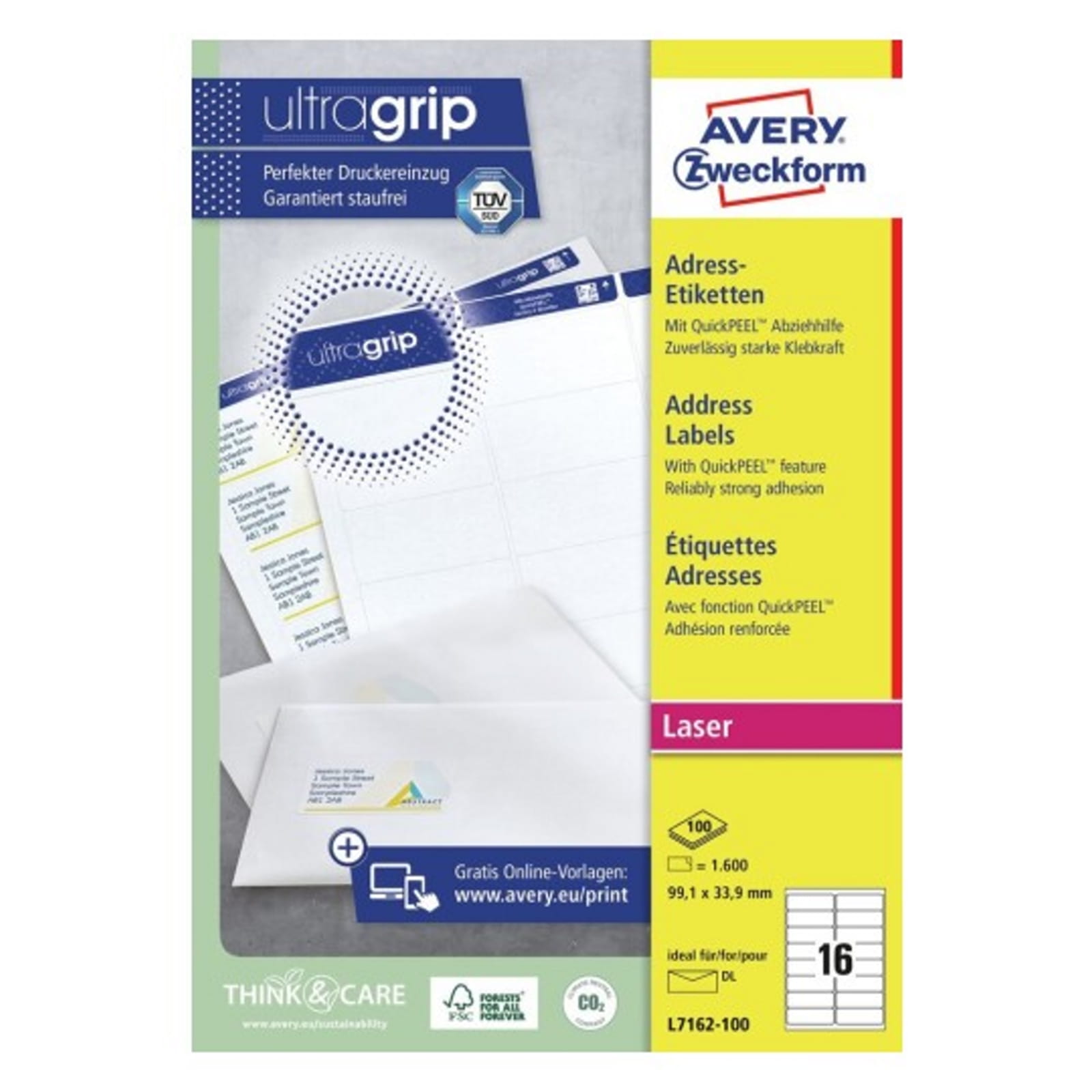 Etykiety adresowe Avery Zweckform L7162-100 o wymiarach 99,1 x 33,9 mm.Przeznaczone do drukarek laserowych, z technologią ultragrip zapewniającą precyzyjne prowadzenie