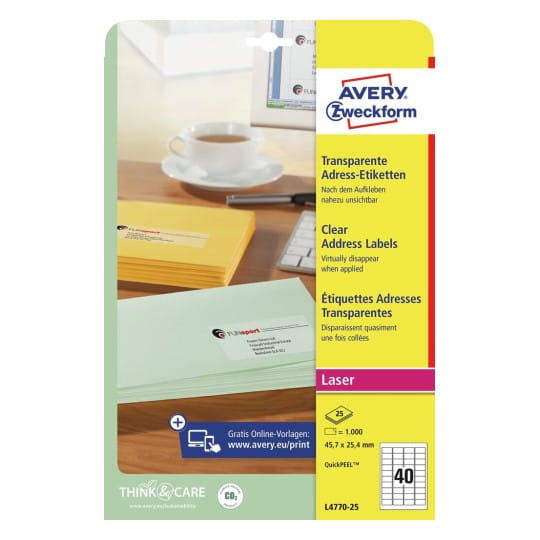 Przezroczyste etykiety adresowe Avery Zweckform L4770-25 mają wymiary 45,7 x 25,4 mm.Wykonane z folii poliestrowej, są odporne na olej, brud, promieniowanie UV,