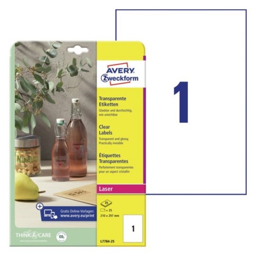 Etykiety do oznaczania CRYSTAL CLEAR poliestrowe AVERY ZWECKFORM 210 x 297mm kol. przezroczysty 25 szt. L7784-25