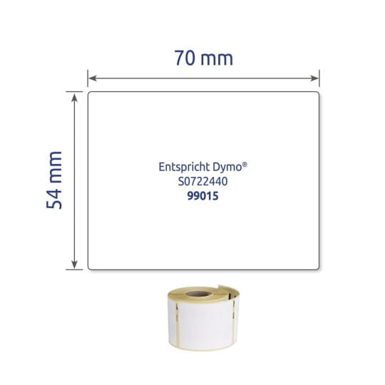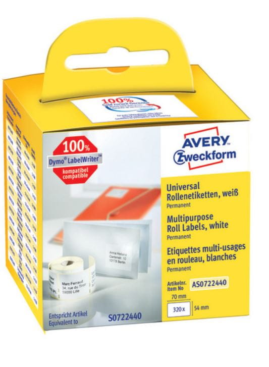Uniwersalne etykiety termiczne Avery Zweckform o wymiarach 54 x 70 mm, kompatybilne z drukarkami DYMO LabelWriter (serii 300, 400, 450, 4XL, Wireless).Zapewniają
