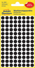 Samoprzylepne etykiety w kształcie kółek Avery Zweckform o średnicy 8 mm, w kolorze czarnym.Idealne do oznaczania, segregowania i organizowania dokumentów
