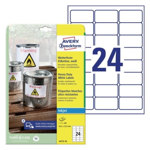 Wodoodporne etykiety poliestrowe Avery Zweckform o wymiarach 63,5 x 33,9 mm, w kolorze białym.Idealne do trudnych warunków, odporne na wodę, olej, zabrudzenia i