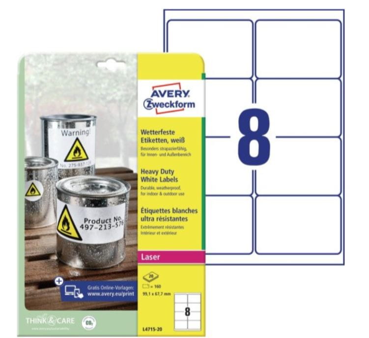 Wodoodporne etykiety poliestrowe Avery Zweckform o wymiarach 99,1 x 67,7 mm, w kolorze białym.Idealne do trudnych warunków, odporne na wodę, olej, zabrudzenia i