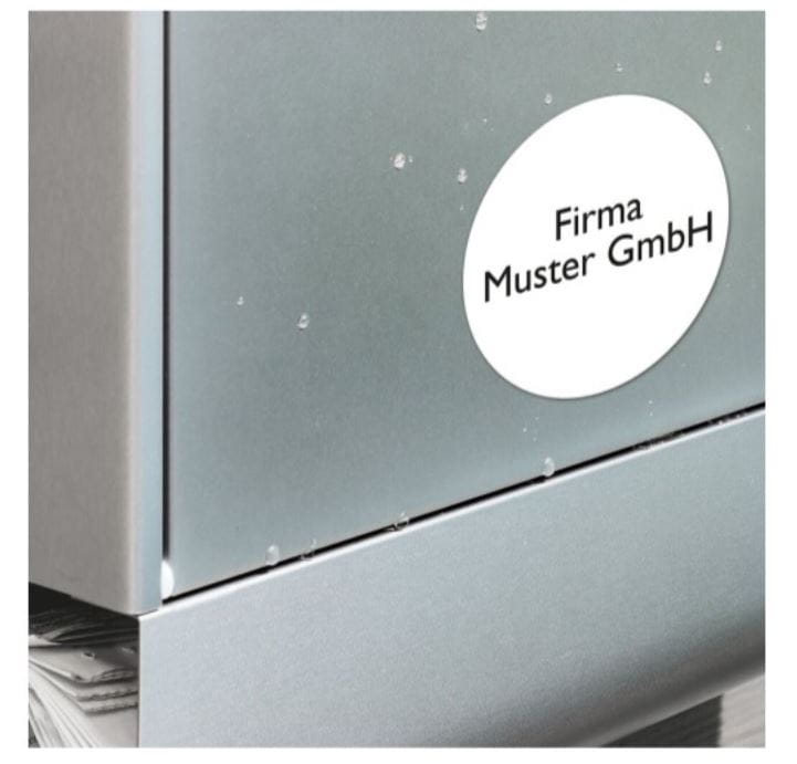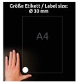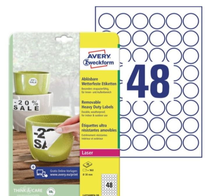 Usuwalne, wodoodporne etykiety poliestrowe Avery Zweckform o średnicy 30 mm, w kolorze białym.Idealne do trudnych warunków, odporne na wodę, olej, zabrudzenia i
