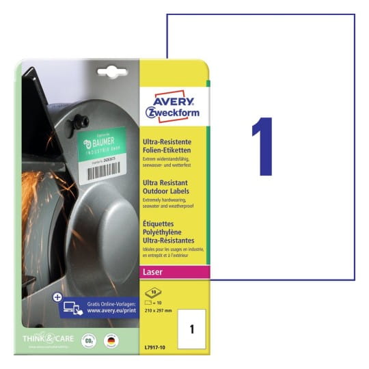 Polietylenowe etykiety ochronne Avery Zweckform o wymiarach 210 x 297 mm, w kolorze białym.Idealne do trudnych warunków, odporne na wodę, olej, zabrudzenia i temperatury.