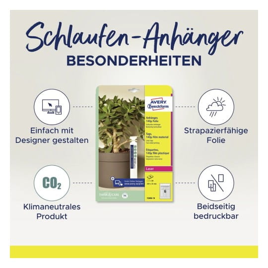 Etykiety pętelkowe AVERY ZWECKFORM to wyjątkowo trwałe i elastyczne oznaczenia przeznaczone do etykietowania roślin, krzewów oraz drzewek w szkółkach, ogrodach i centrach ogrodniczych.Wykonane z odpornej na warunki atmosferyczne folii, są wodoodporne, nie blakną pod wpływem promieniowania UV i wytrzymują zmienne temperatury.