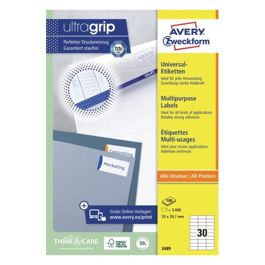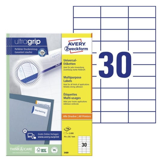 Etykiety uniwersalne ULTRAGRIP papierowe AVERY ZWECKFORM 70 x 29,7mm kol. biały 3000 szt. 3489