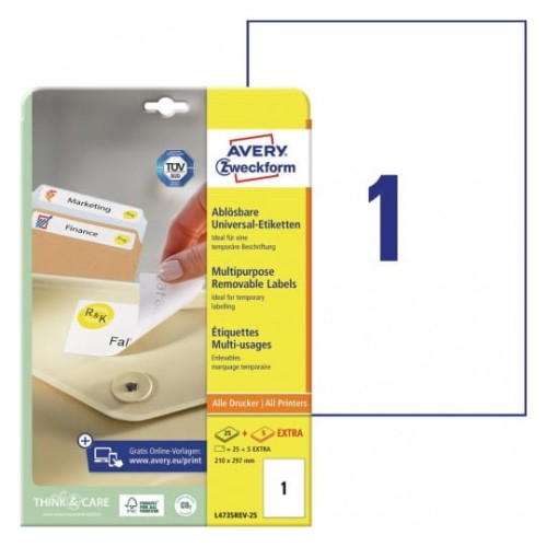 Etykiety uniwersalne usuwalne papierowe AVERY ZWECKFORM 210 x 297mm kol. biały 30 szt. L4735REV-25