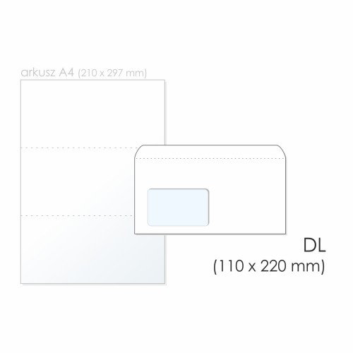 Koperta uniwersalna DL HK BONG kol. biały papier 110 x 220mm 80g okno lewe 45 x 90mm foliowana 50 szt.