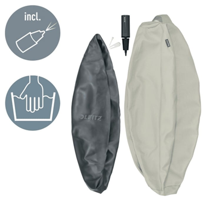 Model Leitz Ergo to nie tylko sprzęt wspierający zdrowie, ale także stylowy element wyposażenia biura czy domowego gabinetu. Zewnętrzny materiałowy pokrowiec w eleganckim, szarym odcieniu doskonale wpisuje się w nowoczesne przestrzenie. W razie potrzeby pokrowiec można łatwo zdjąć i wyprać ręcznie, co ułatwia zachowanie nienagannej higieny. Z myślą o pełnej mobilności, piłka została wyposażona w solidny uchwyt umożliwiający jej swobodne przenoszenie między pomieszczeniami. W ekologicznym zestawie pozbawionym plastiku znajdziesz także ręczną pompkę, zapasowe zatyczki oraz narzędzie ułatwiające ich wyjmowanie.