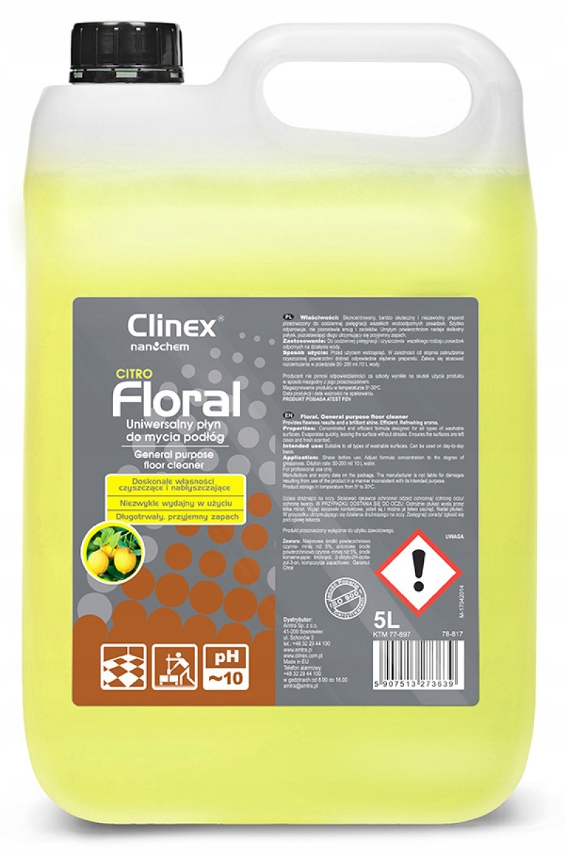 Uniwersalny płyn CLINEX Floral Citro to delikatny i wydajny środek do codziennej pielęgnacji zmywalnych posadzek.Posiada właściwości zmiękczające wodę i antystatyczne,