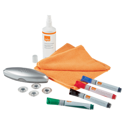 Zestaw startowy Nobo zawiera wszystkie niezbędne akcesoria do efektywnego korzystania ze szklanych tablic suchościeralnych.W zestawie znajdują się