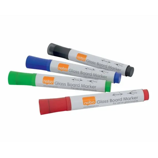 cztery markery do szklanych tablic, gąbka do czyszczenia, płyn czyszczący Nobo o pojemności 250 ml, ściereczka z mikrofibry oraz