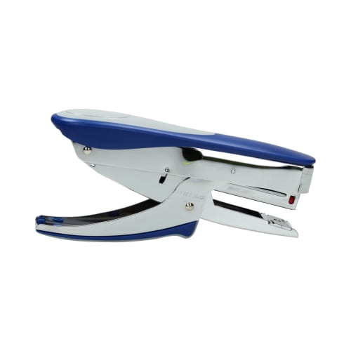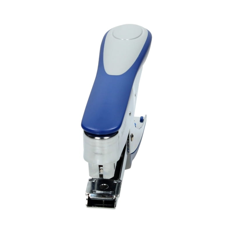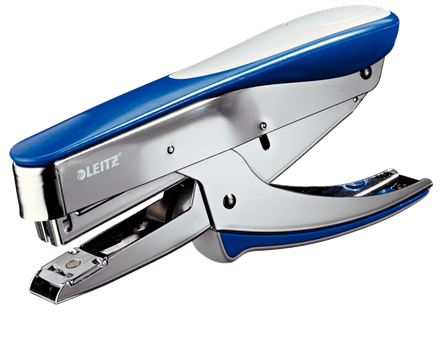 Zszywacz nożycowy LEITZ w kolorze niebieskim ma metalową obudowę połączoną z wysokiej jakości plastikiem.